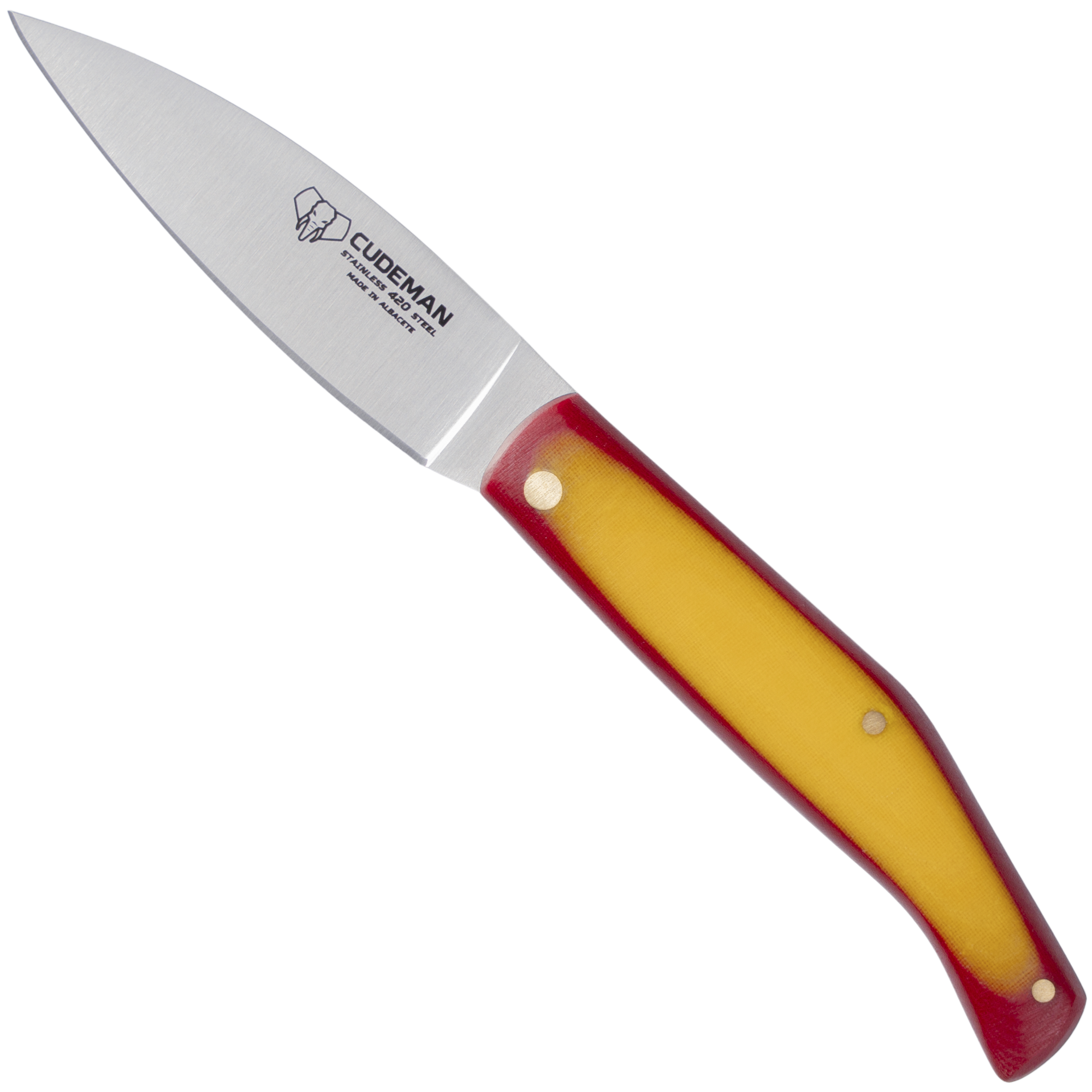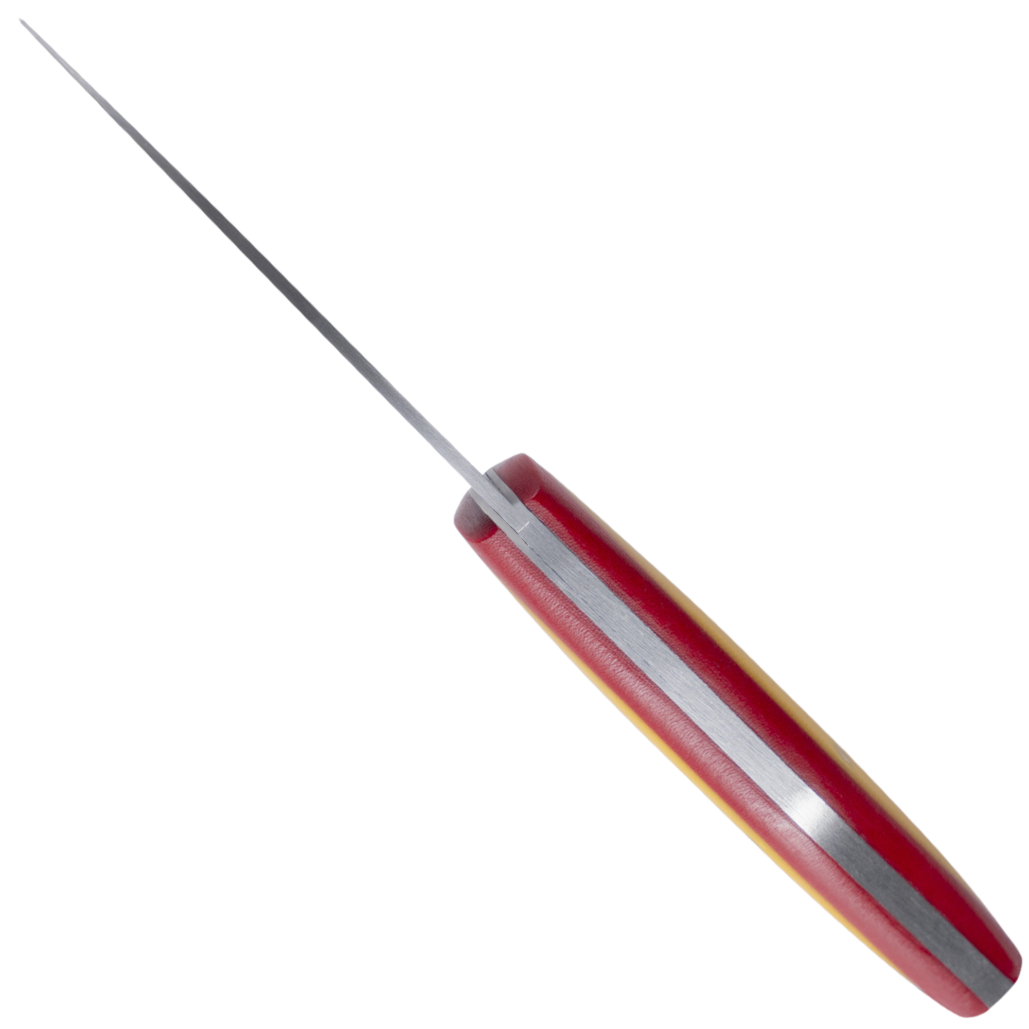 - Material de alto impacto: El mango en micarta roja y amarilla garantiza una durabilidad extrema frente a caídas, humedad y el uso intensivo diario.